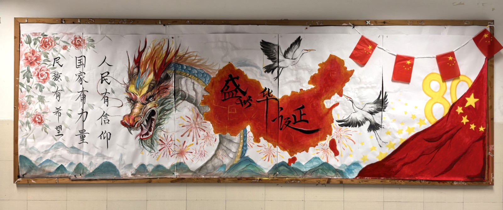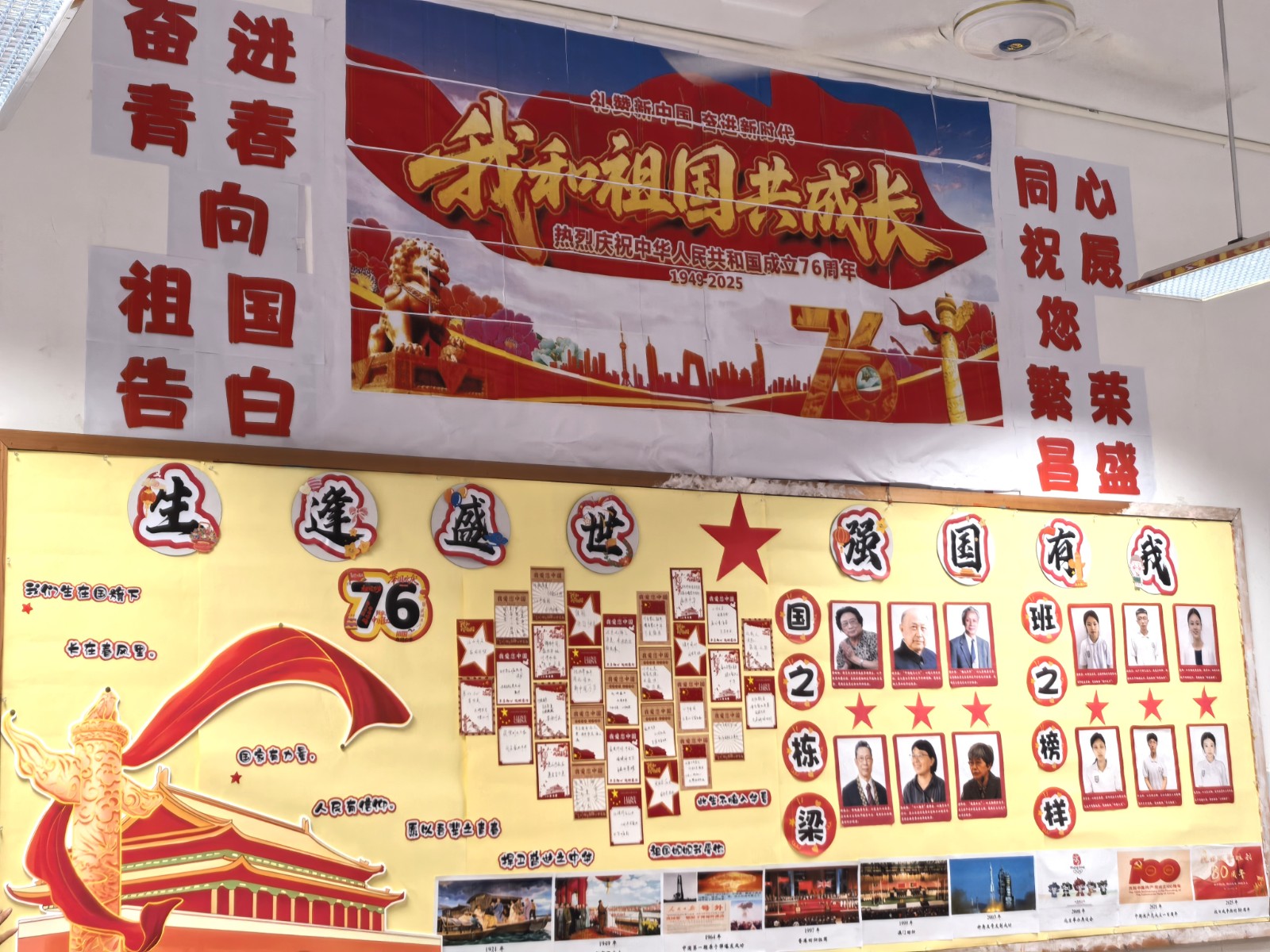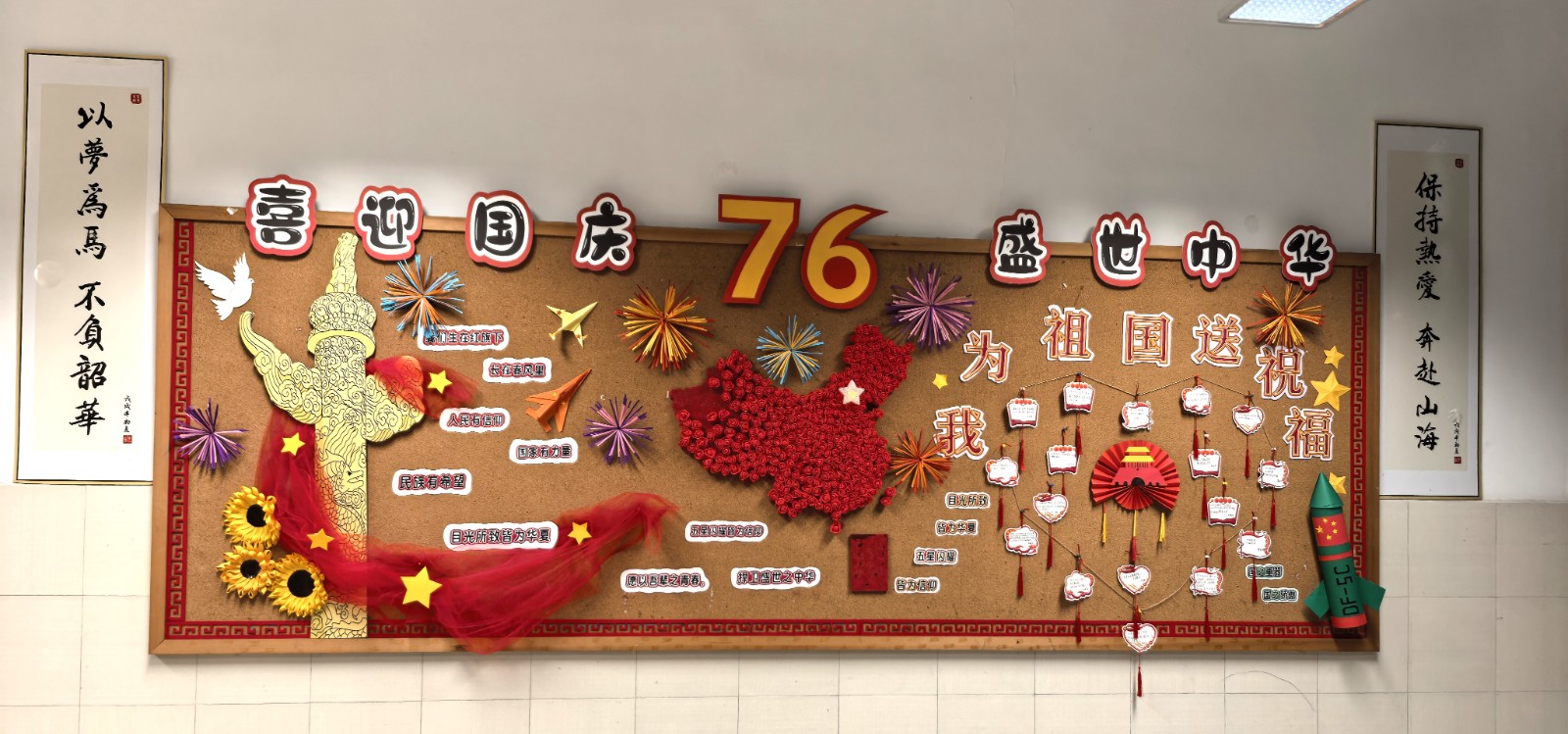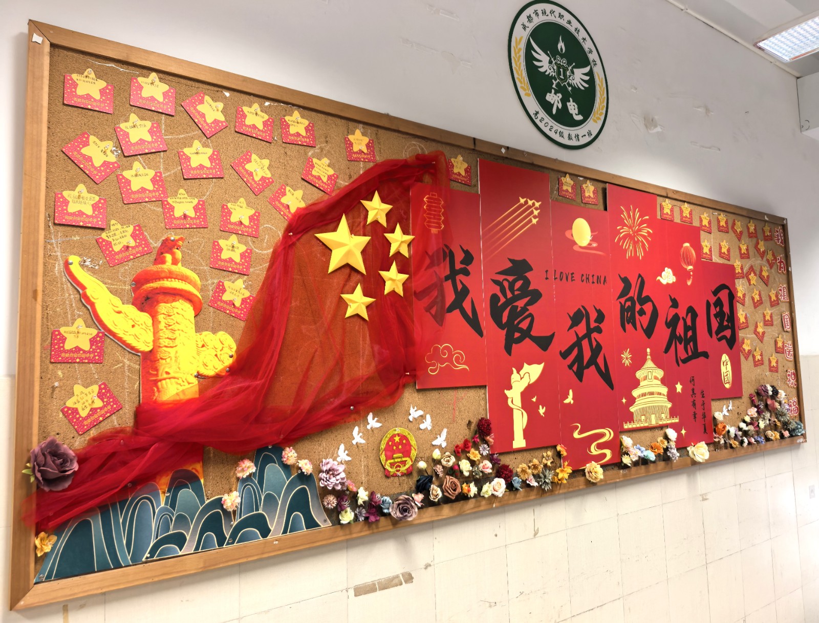 为庆祝中华人民共和国成立76周年,9月19日至29日,校团委、德育处联合举办“我爱中华迎国庆·我爱学习向未来”班级环境创意设计布置比赛。通知一经发出,成龙校区24个班级迅速响应,用青春创意把方寸教室变成沉浸式“红色课堂”与“梦想空间站”。