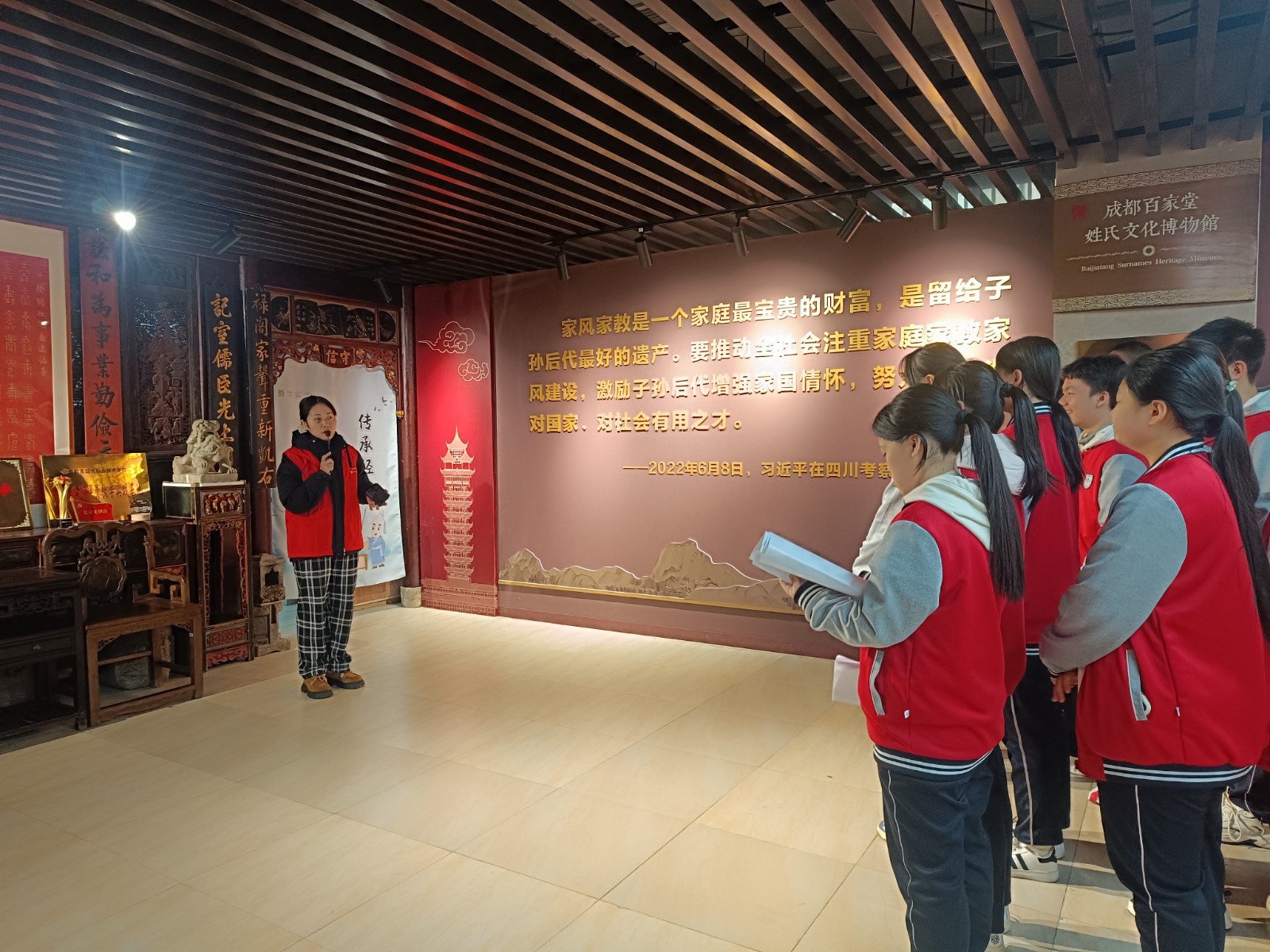 晨雾初散,初冬微寒。2025年11月21日清晨,我校文创社团二十位少年随师移步成都百家堂姓氏文化博物馆,于半日之内,同学们通过静心聆听专业讲解、近距离观摩馆藏,完成了一次文化充电之旅。