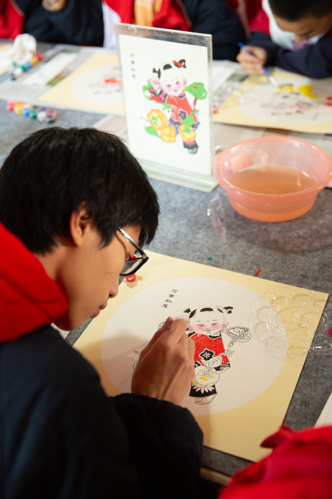 在年画工坊里,同学们化身 “非遗传承人”,亲手参与年画娃娃涂色、印福字等实践。一笔一画勾勒线条、蘸取颜料,感受传统套印技艺的精妙;看着亲手印制的吉祥“福”字,体会年画文化中的生活智慧与美好期许。