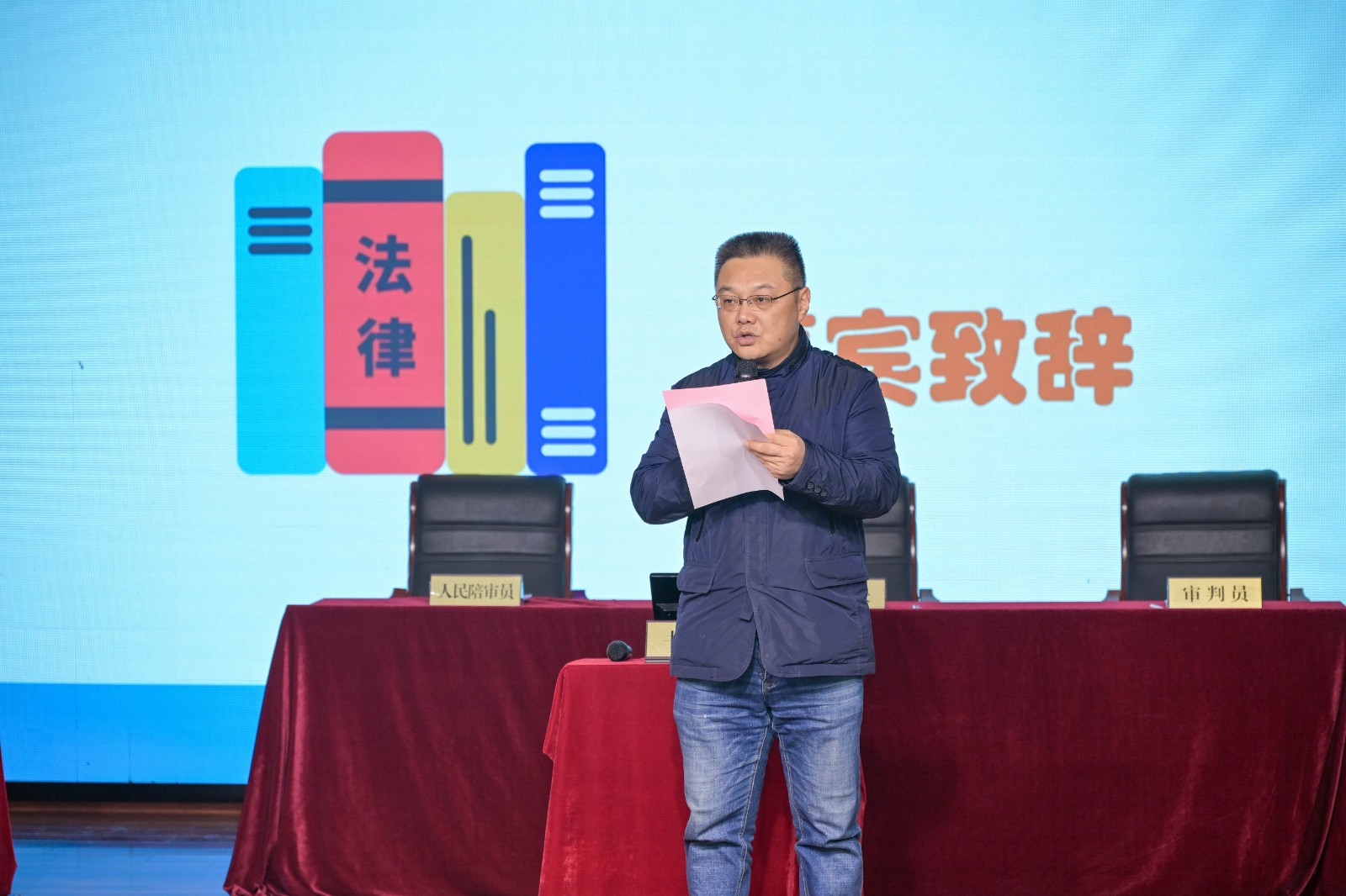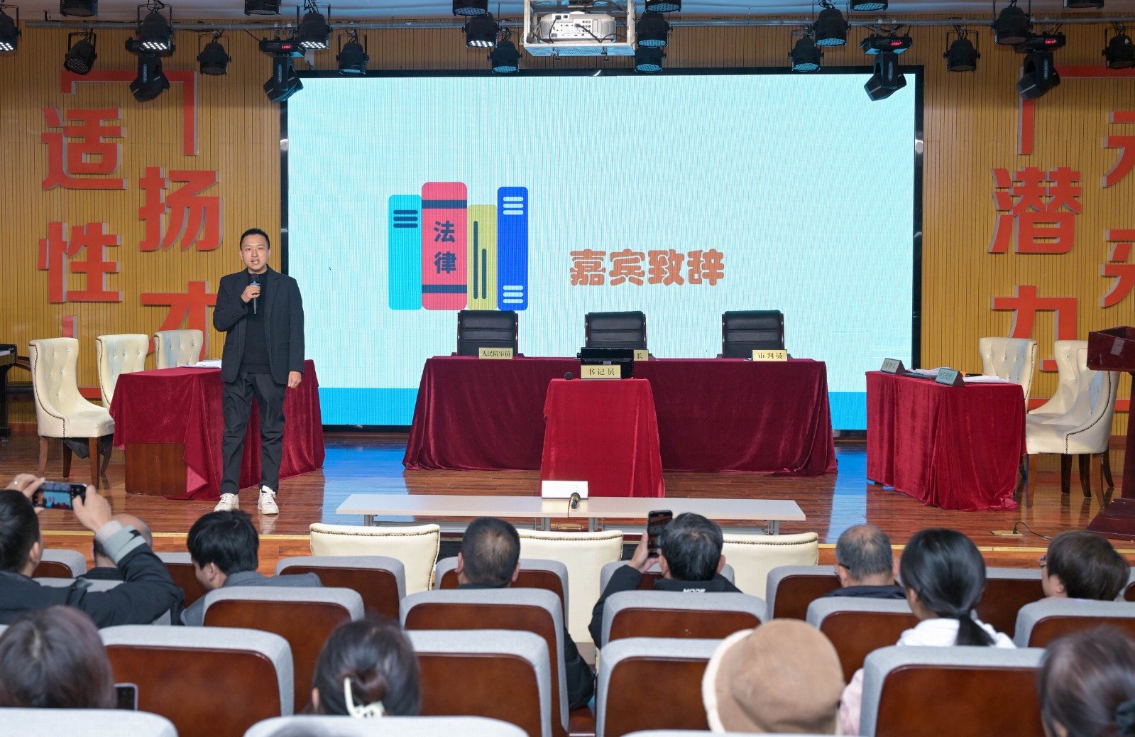 为强化青少年法治意识,筑牢反校园霸凌防线,2025年12月3日,成都市锦江区综合高级中学联合万年场街道长天路社区、四川省法治与社会治理研究会、成都市众心益社会工作服务中心,成功举办“法治进校园之模拟法庭——预防校园霸凌,护苗健康成长”公益普法活动,让学生在沉浸式体验中学习法律知识、远离校园霸凌。活动得到多方专业力量鼎力支持,四川省法治与社会治理研究会宣传中心主任张其丰、长天路社区党委副书记刘凯、众心益社会工作服务中心负责人周恒、学校党委书记刘德艳、长天路社区居民等嘉宾出席现场。张其丰主任在致辞中提到,模拟法庭是法治教育的“活教材”,能让学生在实践中直观感受规则意识与法治精神;学校安办负责人钟世斌也对同学们寄予期望,鼓励大家借此次活动学会用法律武器保护自己,坚决对校园霸凌说“不”。
