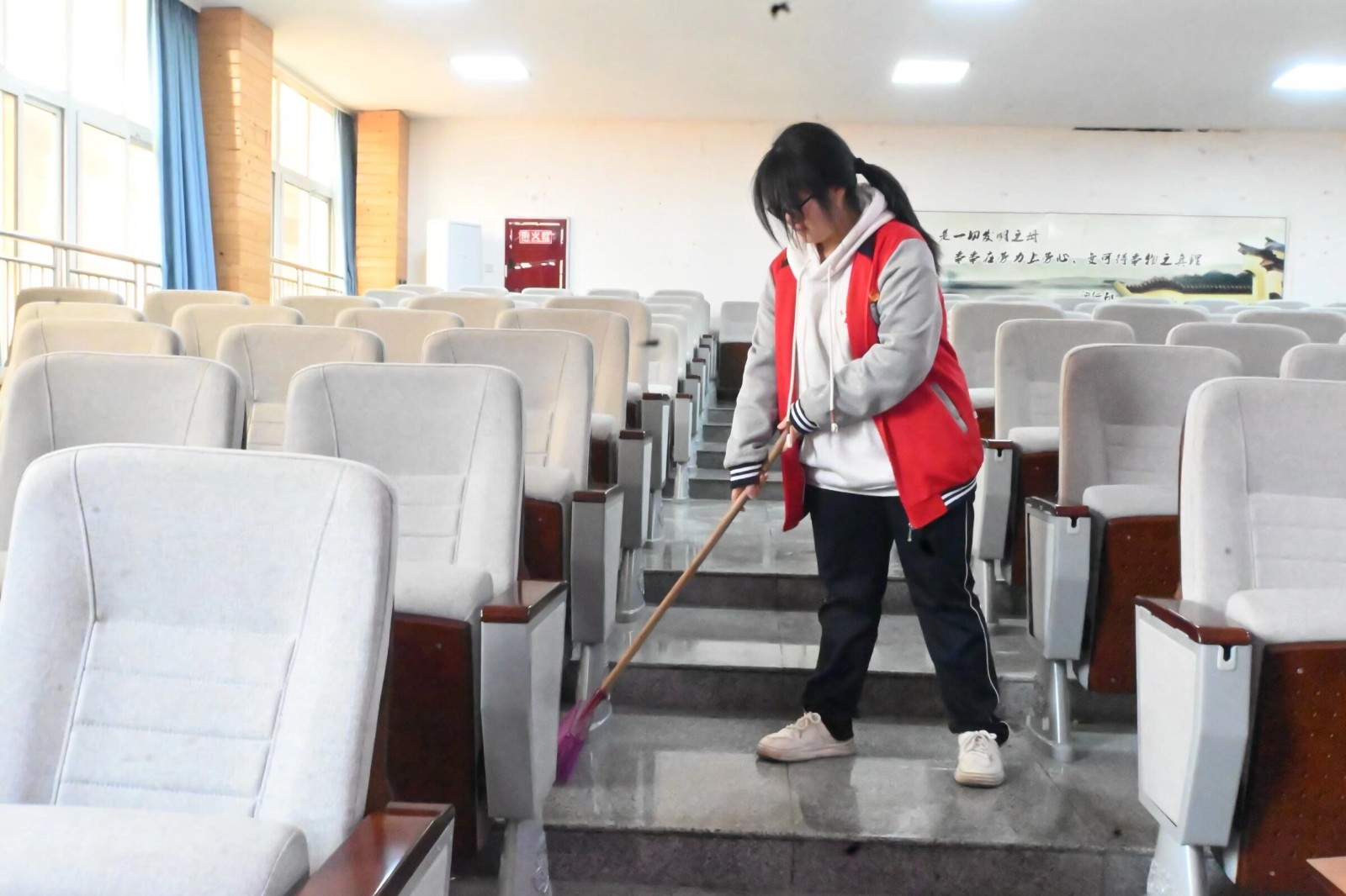 大家不怕脏、不怕累,用双手改善校园环境,经过一番忙碌,原本存在卫生隐患的阶梯教室焕然一新,窗明几净的环境为师生学习活动筑牢了整洁基础。此次清洁行动,不仅是团员志愿者践行“奉献、友爱、互助、进步”志愿精神的具体体现,更让团员们在劳动实践中深化了责任意识与担当精神,以实际行动诠释了共青团员的初心使命。