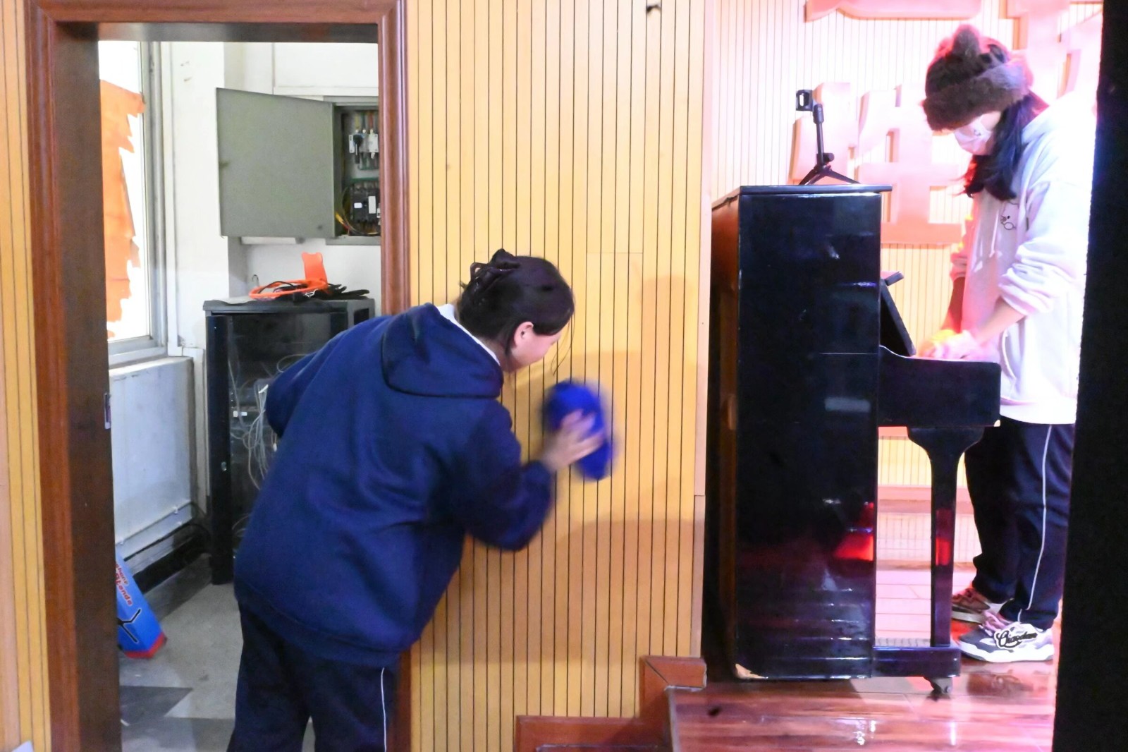 1月15日中午13:00,团员志愿者们佩戴团徽,怀揣责任与热忱,准时携带清洁工具集结于阶梯教室。活动现场,志愿者们分工明确、协作高效,以“不留死角、不留盲区”为原则全力开展清扫:有的手持扫帚细致清扫地面浮尘,有的拎起水桶、挥舞拖把擦拭地面污渍,有的俯身耐心清理桌板缝隙中的杂物,有的耐心擦拭一张张桌椅和椅背,有的分类收纳垃圾并及时清运。